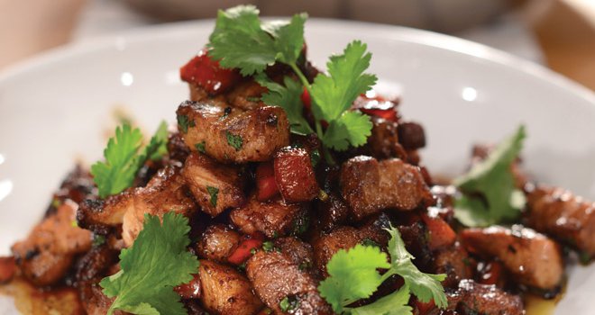 Χοιρινή τηγανιά σβησμένη με ζιβανία, κρέμα βαλσάμικου και φρέσκο κόλιανδρο.