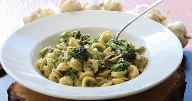 Σοτάρεις το σκόρδο με το ελαιόλαδο μέχρι να αποκτήσουν ένα υπέροχο χρυσό χρώμα. Τεμαχίζεις το λουκάνικο και το προσθέτεις στο τηγάνι όπου έχεις ήδη βάλει το μπρόκολο, με αλάτι και πιπέρι. Βάζεις τα ζυμαρικά να βράσουν σε αλατισμένο νερό. Προσθέτεις την κρέμα στο τηγάνι και 3 κουταλιές νερό από την κατσαρόλα όπου βράζεις τα μακαρόνια. Αφήνεις τα υλικά στο τηγάνι για ακόμη 10 λεπτά έως ότου το λουκάνικο γίνει σκληρό. Αφαιρείς την πάστα από την κατσαρόλα, πριν βράσει τελείως, και τα τοποθετείς στο τηγάνι μέχρι να ετοιμαστούν.