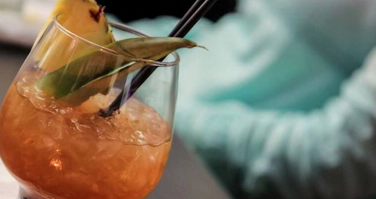 Υλικά: 4cl Σιρόπι Ρούμι, 1cl Σιρόπι Falernum, 1cl Σιρόπι Αμύγδαλου, 2cl Φρέσκο Λάιμ, slice Ανανά στο Τεπαν, dash Bitters, 4cl χυμό ανανά.