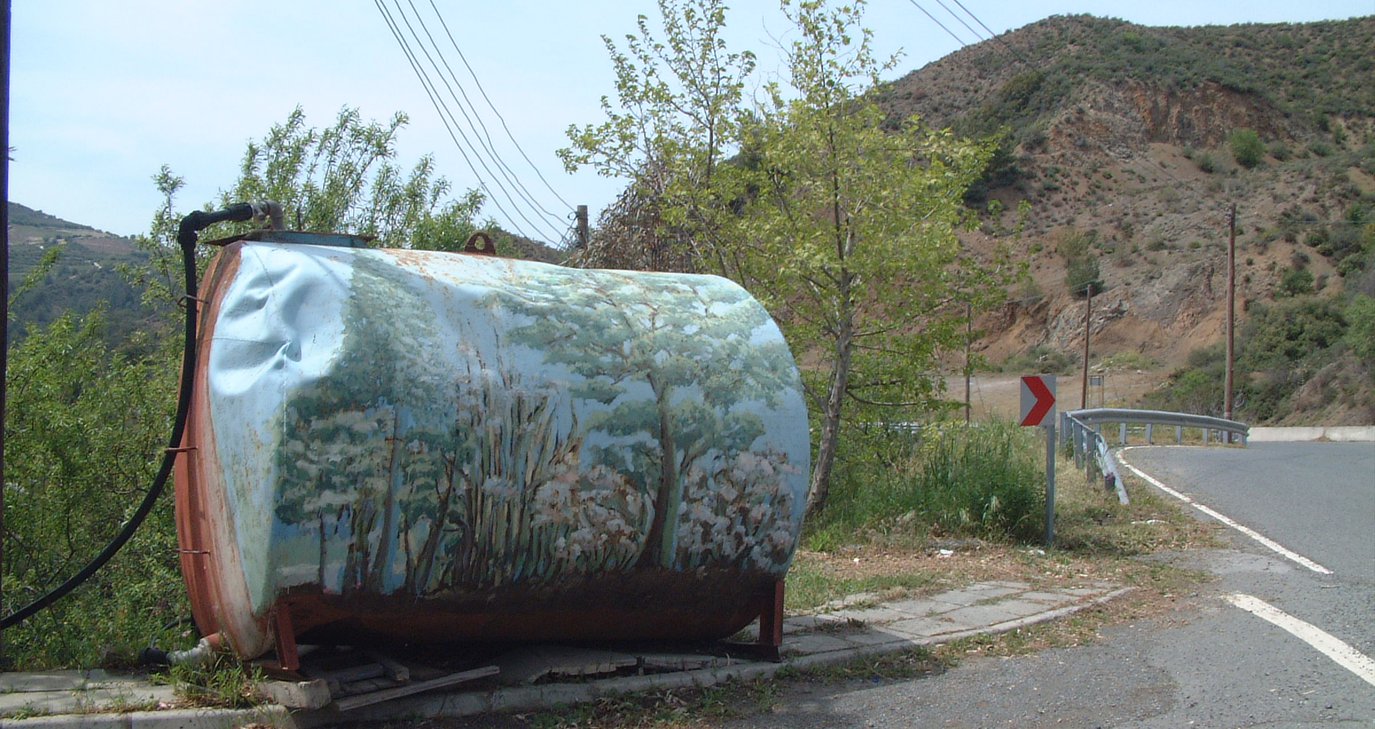 Φωτογράφησα αυτό το… διακοσμημένο ντεπόζιτο, το οποίο θα μπορούσε να βρίσκεται σε δρόμο της Καταλονίας. Κι όμως βρίσκεται λίγο έξω από το χωριό Μανδριά της Λεμεσού, στο δρόμο που σε οδηγεί στον Άγιο Νικόλαο και το γεφύρι του Τζιελεφού.
