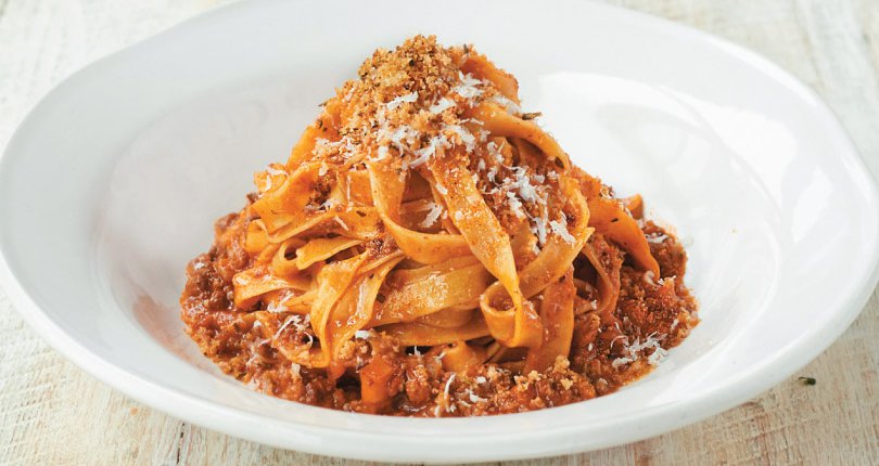 Αποφλοιώνεις το κρεμμύδι και το καρότο και τα ψιλοκόβεις μαζί με το σέλινο. Ρίχνεις 2 κ. ελαιόλαδο στο τηγάνι, σε μέτρια φωτιά, κι αφού ζεσταθεί τα ρίχνεις μέσα και τα σοτάρεις για 10 λεπτά, μέχρι να μαλακώσουν. Προσθέτεις τον πουρέ ντομάτας και συνεχίζεις το ψήσιμο για 5 λεπτά. Έπειτα ρίχνεις το κρασί και αφήνεις το μείγμα να 'πιει' τα υγρά του και να μείνει το μισό. Ψιλοκόβεις την πανσέτα και τη τσιγαρίζεις σε ένα άλλο τηγάνι μαζί με τον κιμά. Τα ψήνεις για 5 λεπτά, ανακατεύοντάς τα με ξύλινο κουτάλι και μέχρι να αποκτήσουν βαθύ καφέ χρώμα. Προσθέτεις το μείγμα μέσα στα ήδη ψημένα λαχανικά και μαζί τη μορταδέλα σε μικρά κομμάτια. Μπαίνουν και οι ντομάτες και αφήνεις όλο το μείγμα να ψηθεί, για 2-3 ώρες, σε χαμηλή φωτιά. Στο τέλος, ρίχνεις και τα αρωματικά. Εν τω μεταξύ, έχεις ψήσει τις ταλιατέλες σε ένα μεγάλο σκεύος με κοχλαστό, αλατισμένο νερό για όση ώρα αναγράφεται στη συσκευασία τους. Αφού ψηθούν τις ρίχνεις μέσα στο μείγμα, τα ανακατεύεις και τα αφήνεις πάνω στη φωτιά για 2 λεπτά. Σερβίρεις το πιάτο ζεστό, με λίγη γαρνιτούρα από μαϊντανό ψιλοκομμένο και τριμμένη παρμεζάνα.