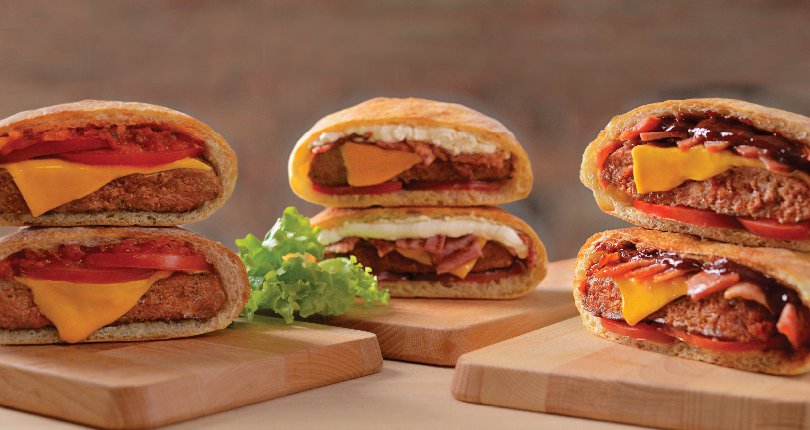 Hut Classic Hut Burger: 100% βοδινό μπιφτέκι, τυλιγμένο στην παραδοσιακή ζύμη της Pizza Hut, με τη χαρακτηριστική σάλτσα Mαρινάρα, τυρί τσένταρ και φρέσκιες ντομάτες