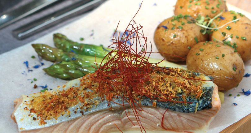 Φρέσκο φιλέτο σολομού ποσέ, με ξύσμα από πορτοκάλι και λεμόνι, πατατούλες βραστές και σπαράγγια