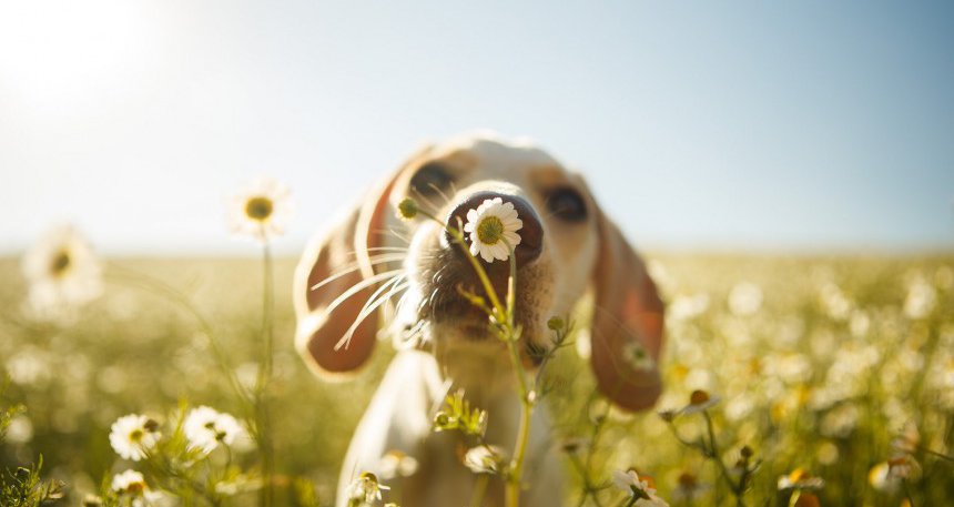 Η Leica μυρίζει το χαμομήλι σε ένα χωράφι κοντά στην πόλη Κουριτίμπα της Βραζιλίας. Κατέκτησε την δεύτερη θέση στην κατηγορία «Σκύλοι στο παιχνίδι». Φωτογραφία: Rodrigo Capuski