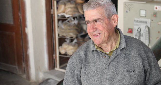 Ο Ανδρέας Μυλωνάς, όνομα και πράμα (!), αλέθει αλεύρι από τότε που θυμάται τον εαυτό του. Παρακολουθούσε πρώτα τον παππού του, τον πατήρ Νικόλα, που είχε το νερόμυλο κάτω στην κοιλάδα απ' όπου περνά ο ποταμός Σερράχης, και ύστερα τον πατέρα του, Σάββα Μιχαήλ, που τον βοηθούσε με το ίδιο μεράκι και την ίδια αγάπη μέχρι το 1983, οπότε έφερε ο ίδιος το μύλο πάνω στο χωριό, δίπλα στο σπίτι του, αλέθοντας μόνο κυπριακό σιτάρι που το συσκευάζει για ντόπια κατανάλωση. "Η μαστορκά είναι στη συντήρηση του μύλου" μας λέει με έμφαση ο κύριος Ανδρέας. Και όση ώρα μας μιλά και τον φωτογραφίζουμε, βάζει κάθε τόσο τα χέρια του κάτω από την αντλία απ' όπου ρέει το αλεσμένο αλεύρι και γεμίζει τις χούφτες του με την "ασπρόσκονη" που την ψηλαφίζει με αγάπη. "Μόνο κυπριακό σιτάρι αλέθω και αυτό που παίρνεις από κοντά μου είναι εκατό τοις εκατό αλεύρι ολικής αλέσεως", μας λέει περήφανα. Και δώσ' του να αδειάζει μέσα στο μύλο σάκους από σιτάρι και να σηκώνει σύννεφα άσπρης σκόνης, δημιουργώντας μια περίεργη ομίχλη πίσω από τον ασταμάτητο θόρυβο της μηχανής... Στο σκοτεινό υποστατικό όπου διατηρεί το μύλο του, οι τοίχοι είναι γεμάτοι παραδοσιακά εργαλεία-κειμήλια, η σοβάντζα φιλοξενεί οικογενειακές φωτογραφίες και αντικείμενα-αντίκες, ενώ σε μια μικρή αποθηκούλα βρίσκονται στοιβαγμένες ξύλινες γούρνες σε διάφορα μεγέθη, κατάλοιπα μιας άλλης εποχής. Στην είσοδο, ένας πίνακας γεμάτος γνωμικά και φωτογραφίες ηρώων, σου δίνει μια διαφορετική εικόνα να περιεργάζεσαι όση ώρα ο μύλος αλέθει, ενώ στο πάνω διάζωμα, η βεράντα του κύριου Ανδρέα και της κυρίας Έλλης, είναι γιομάτη λουλούδια και ζαρζαβατικά. "Πόσο καιρό διατηρείται το αλεσμένο αλεύρι;", τον ρώτησα. "Αν είναι χειμώνας, δύο μήνες, αν είναι καλοκαίρι, άντε ενάμισι μήνα το πολύ και στο ψυγείο καλύτερα", μου είπε χαμογελώντας. Όσο για την τιμή, το ένα κιλό στοιχίζει €1 και ο σάκος, των 25 κιλών, €20. Άρα, αν κάτσεις και σκεφτείς ότι με ένα κιλό φτιάχνεις 2 ψωμιά, τότε σίγουρα σε συμφέρει να αρχίσεις να ζυμώνεις στο σπίτι! Κι αφού μιλάμε για ζύμωμα, ζήτησα από την κυρία Έλλη να μας πει πώς να φτιάξουμε ένα σπιτικό ψωμί. Και ιδού!