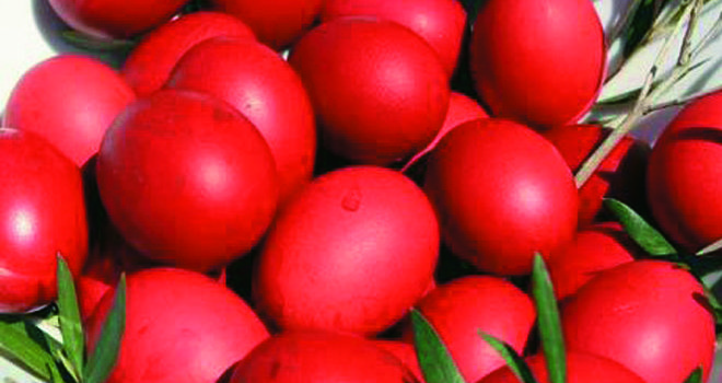 Παραδοσιακό κορνιώτικο ψωμί, φλαούνες και κόκκινα αβγά.