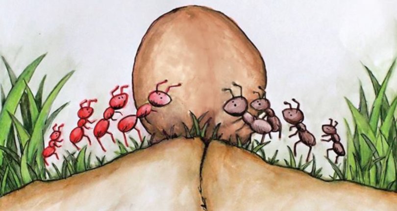 Τα κόκκινα μυρμήγκια και τα καφέ μυρμήγκια ήταν γείτονες... όχι όμως έχοντας καλές σχέσεις... Μια γραμμή στη μέση ήταν το σύνορο τους και φρουροί επιτηρούσαν άγρυπνα τα σύνορα των δυο περιοχών! Μια μέρα όμως ένα παράξενο αντικείμενο έπεσε από τον ουρανό ακριβώς πάνω στη γραμμή που είχαν για σύνορο... Τι ήταν αυτό και ποιος θα το έπαιρνε;