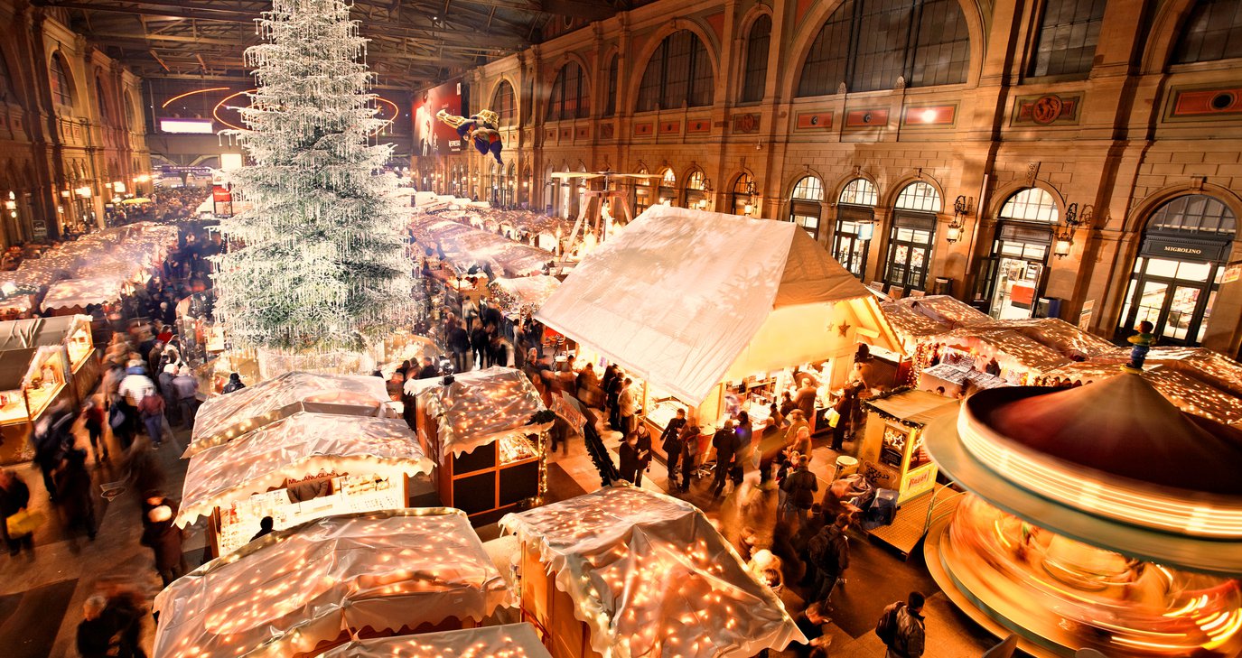 Ο κεντρικός σταθμός της Ζυρίχης είναι το σπίτι για τη μεγαλύτερη σκεπαστή αγορά Χριστουγέννων της Ευρώπης. Γύρω από το τεράστιο δέντρο που αγγίζει σχεδόν την οροφή, υπάρχουν πάνω από 160 πάγκοι με απαράμιλλη κομψότητα! Το χώρο στολίζουν ο γλυκός φωτισμός,ο ήχος από τις παιδικές χορωδίες και το άρωμα της κανέλας… Η ζεστή ατμόσφαιρα που προσφέρει είναι μια εμπειρία που πρέπει να βιώσεις…