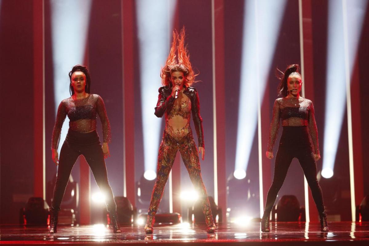 Με μια ολόσωμη δημιιουργία του Βρεττού Βρεττάκου και τέσσερις χορεύτριες στα μάυρα ηλέκτρισαν την ατμόσφαιρα και άφησαν άφωνους τους Eurofans.