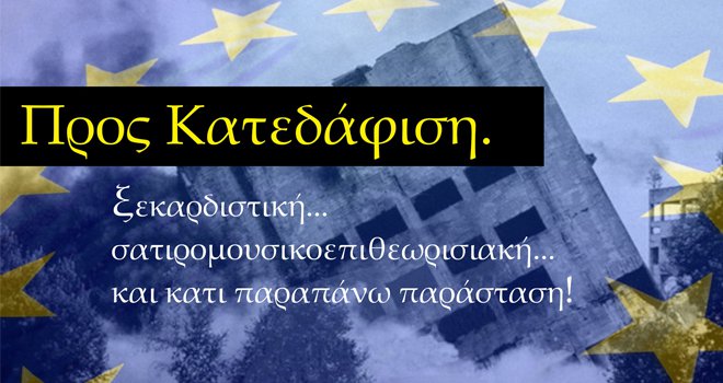 Τι γίνετε όταν όλα είναι στο χείλος του γκρεμού; Κατασκηνώνουμε εκεί; Ή κρατιόμαστε από τους ώμους τραγουδώντας όλοι μαζί, το έχετε γεια βρυσούλες; Και αφού μας κοιτά με άγριο βλέμμα ο Γολιάθ έτοιμος να μας κατασπαράξει, εμείς τι κάνουμε; Μπαίνουμε στην μάχη; Ή του κουνάμε ειρηνευτικά το λευκό μαντίλι... (προς το παρών ακόμα κάνουμε το σταυρό μας). Η παράσταση δεν θέλει να θίξει αλλά να ξυπνήσει αυτούς που δεν λένε να σηκωθούν από το κρεβάτι τους... αυτούς που ακόμα λένε "και αύριο μέρα είναι", αυτούς που περιμένουν υπομονετικά να έρθει ο κοντορεβυθούλης να μας χαρίσει την κότα με τα χρυσά αυγά για να βγούμε από την κρίση... Με τους: Κρίστη Παπαδοπούλου, Ευαγόρα Θεοδοσίου, Άντρεα Αγαπίου και Στέφανο Στεφάνου.