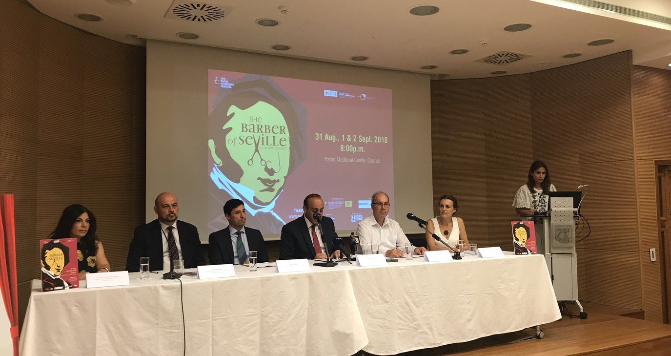 Η επίσημη εξαγγελία των παραστάσεων του Pafos Aphrodite Festival 2018, έγινε στη διάρκεια Συνέντευξης Τύπου που πραγματοποιήθηκε στο Πολιτιστικό Ίδρυμα της Τράπεζας Κύπρου στη Φανερωμένη στη Λευκωσία, όπου ο Πρόεδρος του Δ.Σ της Εταιρείας Pafos Aphrodite Festival Cyprus και Δήμαρχος Πάφου κ. Φαίδωνας Φαίδωνος, τόνισε ότι o θεσμός συμπληρώνει είκοσι χρόνια δημιουργικής πορείας και η ανάγκη για αρτιότητα του θεσμού, τόσο από καλλιτεχνικής όσο και από οργανωτικής άποψης, γίνεται ακόμη μεγαλύτερη. Ο μαγευτικός χώρος της πλατείας του Μεσαιωνικού Κάστρου της Πάφου πρόσθεσε, θα αποτελέσει ένα μοναδικό σκηνικό αντάξιο των υψηλών απαιτήσεων της φημισμένης κωμικής όπερας του μεγάλου μουσουργού Gioachino Rossini «Ο Κουρέας της Σεβίλλης». Για μια ακόμη φορά επεσήμανε, το Pafos Aphrodite Festival θα φιλοξενήσει στη σκηνή του, ιταλική παραγωγή με καταξιωμένους και έμπειρους συντελεστές. Η συνεργασία αυτή που αναπτύσσεται μέσω του πολιτισμού τόνισε ο Δήμαρχος Πάφου, ενισχύει και εμπλουτίζει τις διαχρονικές σχέσεις φιλίας μεταξύ Ιταλίας και Κύπρου και αποδεικνύει ότι υπάρχει γόνιμο έδαφος για την ανάπτυξη ουσιαστικής συνεργασίας μεταξύ των δύο χωρών, ιδιαίτερα στον τομέα της Τέχνης και του Πολιτισμού.