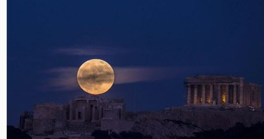 Η φωτογραφία είναι παρμένη από ένα αθηναικό μπαλκόνι και αποτυπώνει την τελευταία πανσέληνο του έτους όπως αυτή ανέτειλε πάνω από την Ακρόπολη. Αυτήν την φωτογραφία επέλεξε το National Geographic για να αποχαιρετήσει το 2018.