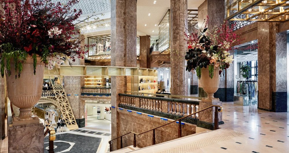 Στο νέο κατάστημα, ουσιαστικά ένα concept store, διατηρήθηκε το αυθεντικό Αρ Ντεκό αίθριο του κτιρίου, κάτω από το οποίο αναπτύσσεται μια γυάλινη σκάλα με θέα στη Σανς Ελιζέ. Στο εσωτερικό του έξι γυάλινα κουτιά, σαν βιτρίνες, μοιάζουν να αιωρούνται στον γεμάτο φως χώρο. Σε 6.500 τ.μ. και τέσσερα επίπεδα, κορυφαίοι οίκοι όπως οι Chanel, Gucci, Balenciaga, Loewe συνυπάρχουν με ναούς της γαστρονομίας σαν τη σοκολατερί του Alain Ducasse και το αγαπημένο παριζιάνικο vegan στέκι Maisie Cafe.