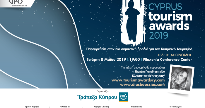 Tα Cyprus Tourism Awards, που παρουσιάζει η Τράπεζα Κύπρου διοργανώθηκαν από τον Εκδοτικό Οίκο ΔΙΑΣ και την Boussias Communications, υπό την αιγίδα του του Υφυπουργείου Τουρισμού, του Cyprus Hotel Association και του Συνδέσμου Τουριστικών Επιχειρήσεων Κύπρου.