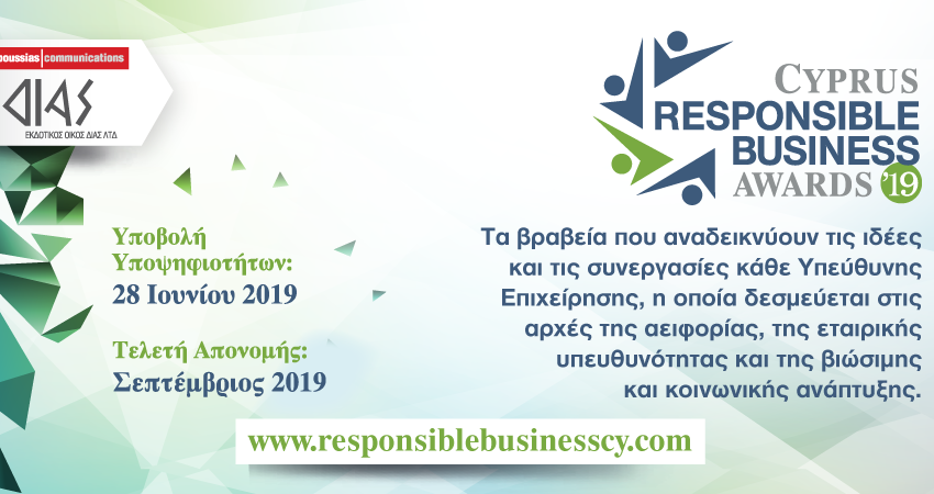 Ο Εκδοτικός Οίκος Δίας και η Τηλεόραση Σίγμα σε συνεργασία με την Boussias Communications, διοργανώνουν, για πρώτη φορά, τα Cyprus Responsible Business Awards 2019, με στόχο να αναδείξουν και να επιβραβεύσουν τα έργα, τις ιδέες και τις συνεργασίες πίσω από τη δέσμευση των Υπεύθυνων Επιχειρήσεων και Φορέων της Κύπρου στις αρχές της αειφορίας, της εταιρικής υπευθυνότητας και της βιώσιμης και κοινωνικής ανάπτυξης.