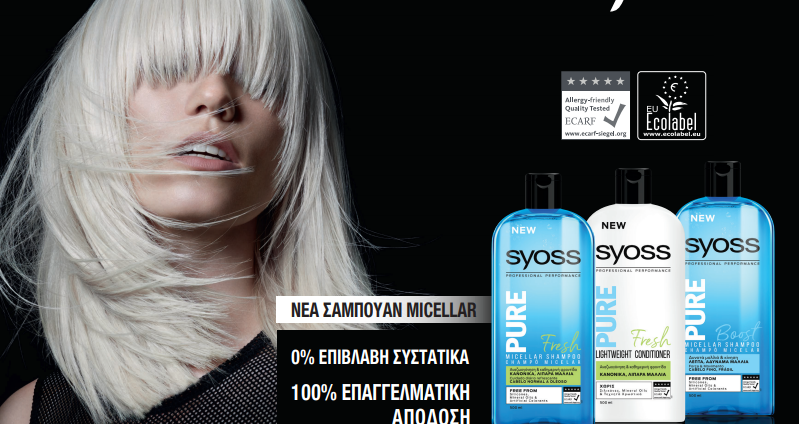 Το Syoss δημιούργησε τα μοναδικά προϊόντα καθημερινής περιποίησης μαλλιών Syoss Pure με τεχνολογία Micellar, χωρίς σιλικόνες, mineral oils και τεχνητά χρωστικά. Πρόκειται για την πρώτη σειρά που στηρίζεται στην επαγγελματική εξειδίκευση και δημιουργεί προϊόντα χωρίς πρόσθετα, επιβλαβή στοιχεία, τα οποία σε συνδυασμό με τον βαθύ και απαλό καθαρισμό που προσφέρει το νερό Micellar εξασφαλίζουν περιποίηση επαγγελματικής απόδοσης.