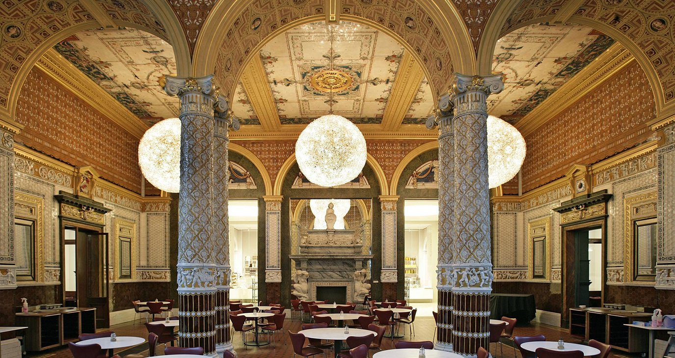 Μπαίνοντας στο καφέ του Μουσείου Victoria and Albert (V&A) στο Λονδίνο είναι σαν να εισέρχεσαι στο εσωτερικό ενός αβγού Φαμπερζέ. Το πρώτο καφέ μουσείου στον κόσμο άνοιξε το 1856, αλλά στη συνέχεια κατεδαφίστηκε για να ανοίξει και πάλι το 1868 διαμορφωμένο πλέον σε τρεις διαφορετικές αίθουσες για καφέ, τσάι, φαγητό. Κάθε μία από αυτές φέρει τα ονόματα των σχεδιαστών τους, του Τζέιμς Γκαμπλ, του Έντουαρντ Πόιντερ και του Ουίλιαμ Μόρις.