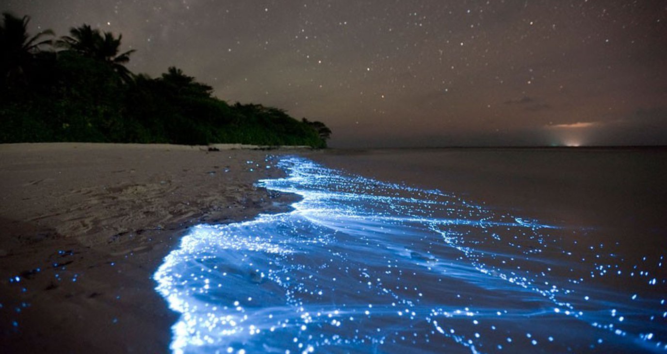 Οι Bioluminescent παραλίες μπορούν να αναπτυχθούν σχεδόν οπουδήποτε. Πλαγκτόν και φύκια λάμπουν με το δικό τους φως, κάτι που ονομάζεται βιοφωτισμός. Επειδή απαιτείται ενέργεια για να λάμψουν, παράγουν φως μόνο υπό ορισμένες συνθήκες. Όταν πληρούνται αυτές οι συνθήκες, μπορούν να φωτίσουν μια ολόκληρη παραλία. Μια τέτοια είναι η παραλία Mosquito Bay στο Πουέρτο Ρίκο, όπου η λάμψη της σπινθηροβόλησης από το μπλε φως είναι εντυπωσιακή.