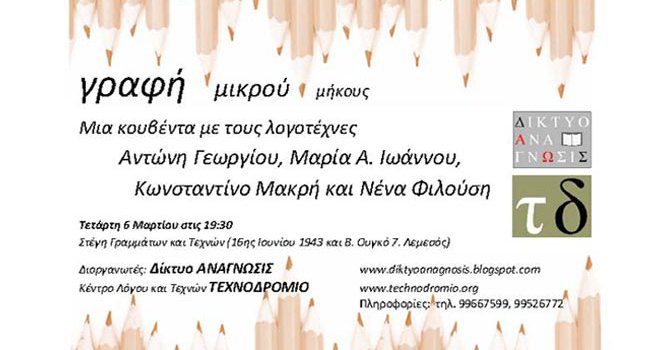 Το Δίκτυο «Ανάγνωσις» που αποτελείται από τις Λέσχες Ανάγνωσης «Βιβλιοτρόπιο», «Πυρείον» και τη λογοτεχνική ομάδα «Μεταξύ γραφής και ανάγνωσης» σε συνεργασία με το Κέντρο Λόγου και Τεχνών «Τεχνοδρόμιο» διοργανώνει την εκδήλωση "Γραφή μικρού μήκους". Εκεί θα έχεις την ευκαιρία να μιλήσεις με τους λογοτέχνες: Αντώνη Γεωργίου, Μαρία Α. Ιωάννου, Κωνσταντίνο Μακρή και Νένα Φιλούση.