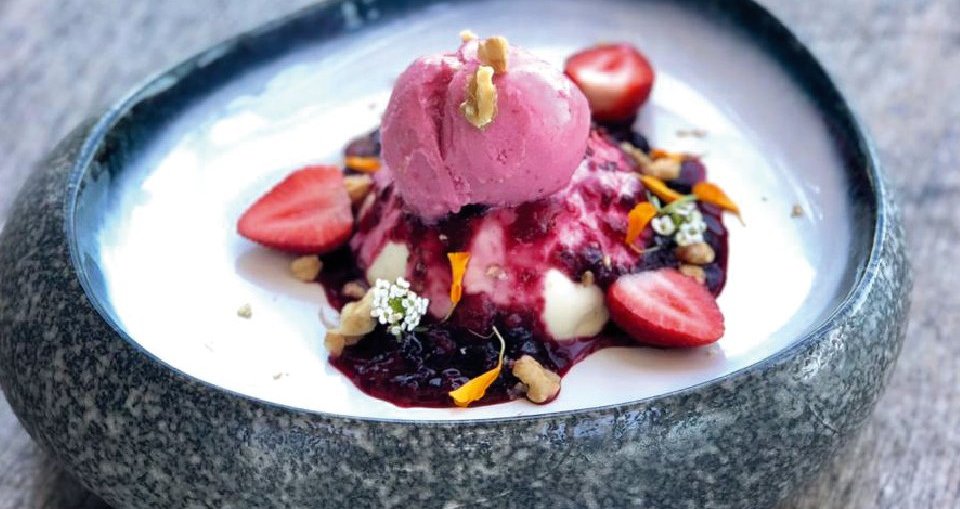Όπως για παράδειγμα τη λαχταριστή πανακότα του, με τα φρέσκα μούρα , τις φράουλες, τα καραμελωμένα καρύδια και το παγωτό φράουλας.