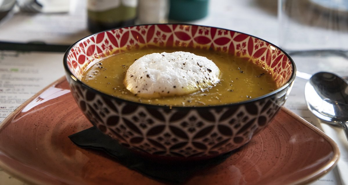 Η σούπα: Κόκκινες φακές με γλυκοπατάτα (€7), για σένα που θέλεις να δοκιμάσεις κάτι ζεστό αλλά συγχρόνως να απολαύσεις και τις φακές σε μία άλλη εκδοχή.