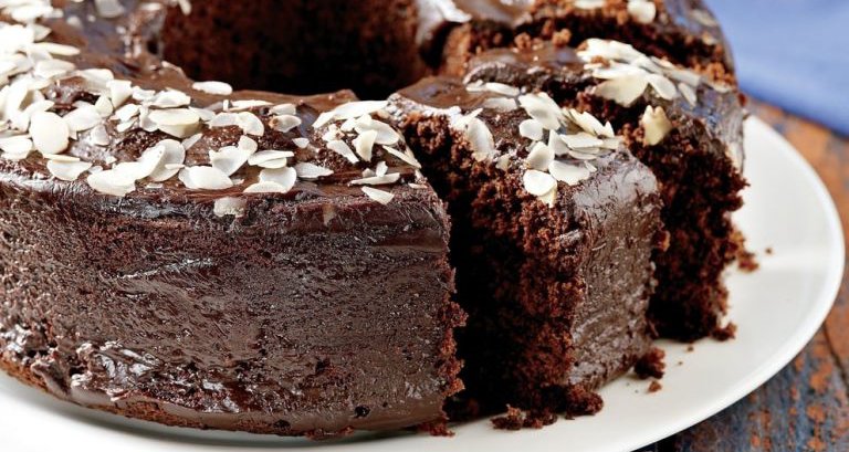 Αφού τοποθετήσουμε το κέικ σε πιατέλα, το περιχύνουμε με το γλάσο του. Αν θέλουμε, πασπαλίζουμε αμύγδαλο φιλέ για γαρνίρισμα.