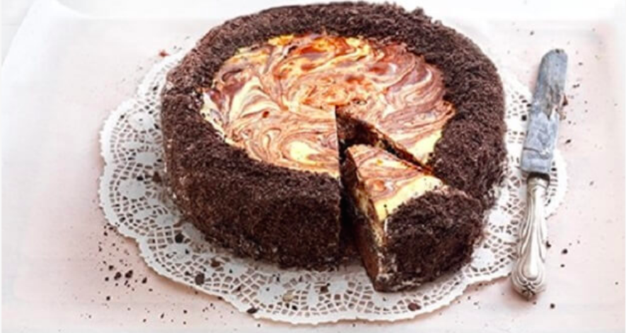 Ρίχνουμε τη λιωμένη σοκολάτα στην κρέμα (που κρατήσαμε. ) Aνακατεύουμε καλά. Αφήνουμε κουταλιές από την σοκολατένια κρέμα ,πάνω στην κρέμα τυριού. Πιέζουμε να μπουν μέσα στην λευκή κρέμα. Με μαχαίρι ανακατεύουμε τα δυο μίγματα και κάνουμε την επιφάνεια σαν μάρμαρο με νερά.Θα ψήσουμε σε μπεν μαρί. Βάζουμε ταψί με ζεστό νερό , και βάζουμε μέσα το cheesecake. Το νερό πρέπει να καλύπτει τη μισή φόρμα.