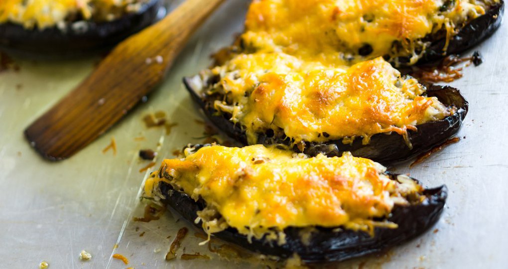 - Πλένουμε και σκουπίζουμε τις μελιτζάνες. Κόβουμε και πετάμε τα κοτσάνια τους και τις μοιράζουμε στη μέση. Με μαχαίρι χαράζουμε σταυρωτά τη σάρκα. Με κουτάλι της σούπας αφαιρούμε προσεκτικά την ψίχα κάθε μελιτζάνας αφήνοντας περίπου 1 εκ. πάχος κοντά στη φλούδα.