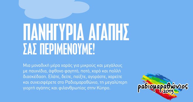 Τέσσερα μεγάλα πανηγύρια αγάπης διοργανώνονται την Κυριακή 20 Οκτωβρίου στην Αρχή Κρατικών Εκθέσεων Κύπρου (Ανατολική είσοδος) μεταξύ 10.00 με 18.00, στο Δημόσιο Κήπο της Λεμεσού μεταξύ 10.00-18.00, στην Πλατεία Αγ. Γεωργίου στο Παραλίμνι μεταξύ 13.00-21.00 και στην Πλατεία Κίμωνα στις Φοινικούδες (Κεντρική Εξέδρα) 10.00-18.00 στη Λάρνακα. Τα πανηγύρια πραγματοποιούνται σε συνέχεια του πρώτου πανηγυριού αγάπης που πραγματοποιήθηκε με μεγάλη επιτυχία την περασμένη Κυριακή στην Πάφο και με δυνατό σύνθημα "Μόνο η αγάπη μπορεί" η διοργανωτική αρχή του Ραδιομαραθωνίου 2013, με τη στήριξη της Τράπεζας Κύπρου και του Super Fm. Σκοπός τους γ’ ακόμη μια χρονιά είναι να ευαισθητοποιήσουν το κοινό και να συλλέξουν εισφορές για τους ιερούς σκοπούς του Ραδιομαραθωνίου, που τόσα χρόνια αγκαλιάζεται ανελλιπώς με μεγάλη επιτυχία από τον κόσμο. Στις εκδηλώσεις, μικροί και μεγάλοι θα έχουν την ευκαιρία να περάσουν μια μοναδική μέρα χαράς, να απολαύσουν άφθονο φαγητό, ποτό, χορό και διασκέδαση συνεισφέροντας παράλληλα στη μεγαλύτερη γιορτή αγάπης και φιλανθρωπίας στην Κύπρο.