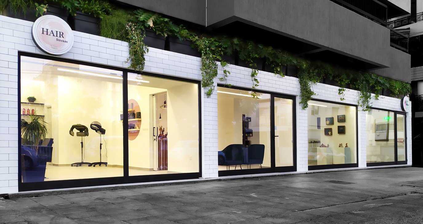 Η πρόσοψη με τα μεγάλα ανοίγματα προσφέρει φυσικό φως στην γκαλερί και στο χώρο περιποίησης μαλλιών, συνδυάζοντας την απλότητα των άσπρων κεραμικών με τη φυσική ομορφιά των φυτών και του πράσινου.