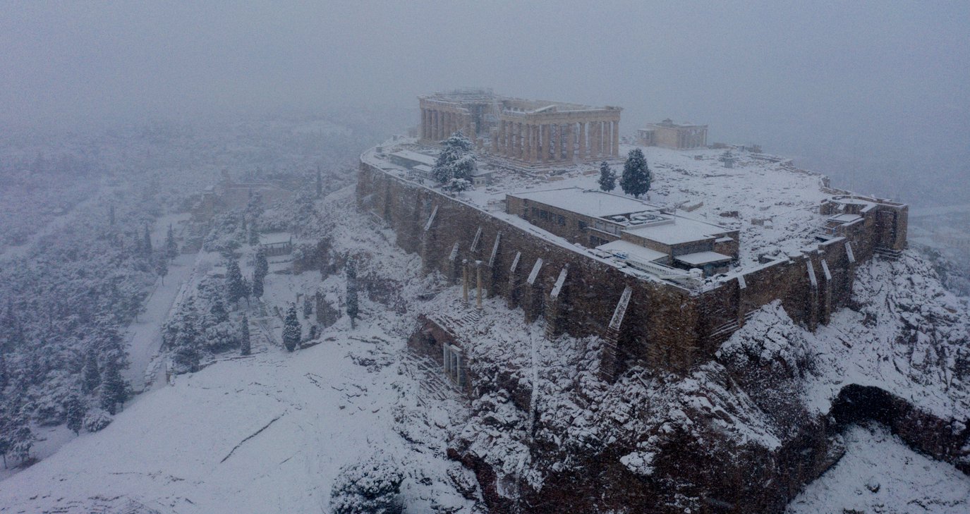 Το χιόνι κάλυψε όλο το κέντρο της Αθήνας, αλλά και τα νότια προάστια της Αττικής. Τα βόρεια προάστια έχουν για την ώρα την μεγαλύτερη χιονοκάλυψη, αλλά η εικόνα του χιονισμένου βράχου της Ακρόπολης είναι εκτός από εντυπωσιακή και σπάνια.