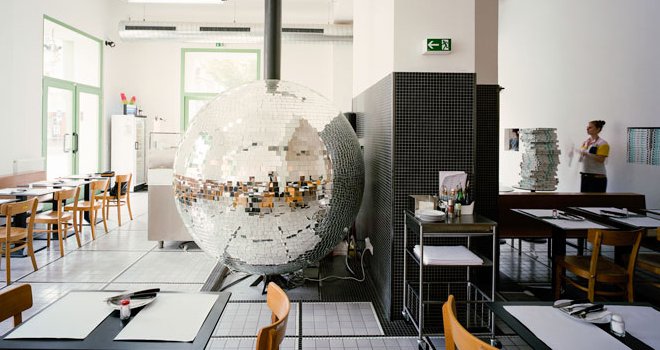 Ο Lukas Galehr του Madame Mohr Studio επινόησε κάτι ανατρεπτικό… ‘Έντυσε’ τον περιστρεφόμενο ξυλόφουρνο μιας πιτσαρίας, σαν disco ball, εξ ου και το όνομα του χώρου: ‘Disco Volante’. Βέβαια, το όνομα αυτό σημαίνει ιπτάμενος δίσκος, όμως έχει κι έναν συνειρμό με το σκάφος διαφυγής του εχθρού του James Bond, Emilio Largo! Όπως και να ΄χει, η βιεννέζικη πιτσαρία διαθέτει στυλ!