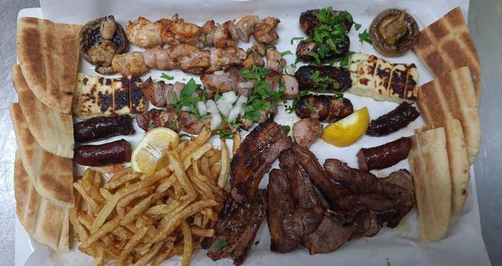 Το πιάτο περιλαμβάνει 2 κομμάτια χαλούμι, 2 λουκάνικα, 2 παστουρμά, 2 σμίλες χοιρινό, 2 σμίλες κοτόπουλο, 4 σιεφταλιές, 4 παϊδάκια, 2 μπέικον κρασάτο, 2 μανιτάρια, πατάτες & σαλάτα.