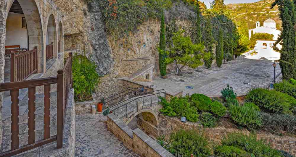 Ο Άγιος Νεόφυτος μετέτρεψε τη φυσική σπηλιά σε ασκητήριο με δύο χώρους. Ο πρώτος χώρος περιελάμβανε μία μικρή εκκλησία αφιερωμένη στον Τίμιο Σταυρό και ο δεύτερος το κελλί του Αγίου, μέσα στο οποίο λάξευσε και τον τάφο του. Το κελλί του επικοινωνούσε με το ιερό βήμα της εκκλησίας. Ο Άγιος απομονώθηκε στην Εγκλείστρα μέχρι το 1170, οπότε χειροτονήθηκε ιερέας από τον Επίσκοπο Πάφου Βασίλειο Κίνναμο και η φήμη του εξαπλώθηκε γρήγορα στο νησί. Πολλοί μοναχοί συγκεντρώθηκαν γύρω του και σχημάτισαν μοναστική κοινότητα, για την οποία ο Άγιος Νεόφυτος συνέταξε την «Τυπική Διαθήκη», ένα είδος κανονισμών για την λειτουργία του μοναστηριού. Η επιθυμία του Αγίου για ησυχία και απομόνωση, τον προέτρεψε να λαξεύσει άλλη Εγκλείστρα, πιο ψηλά στο βράχο, πάνω από το παλαιό παρεκκλήσι. Δίπλα στο νέο του κελλί λάξευσε μικρό παρεκκλήσι αφιερωμένο στον Άγιο Ιωάννη τον Πρόδρομο.