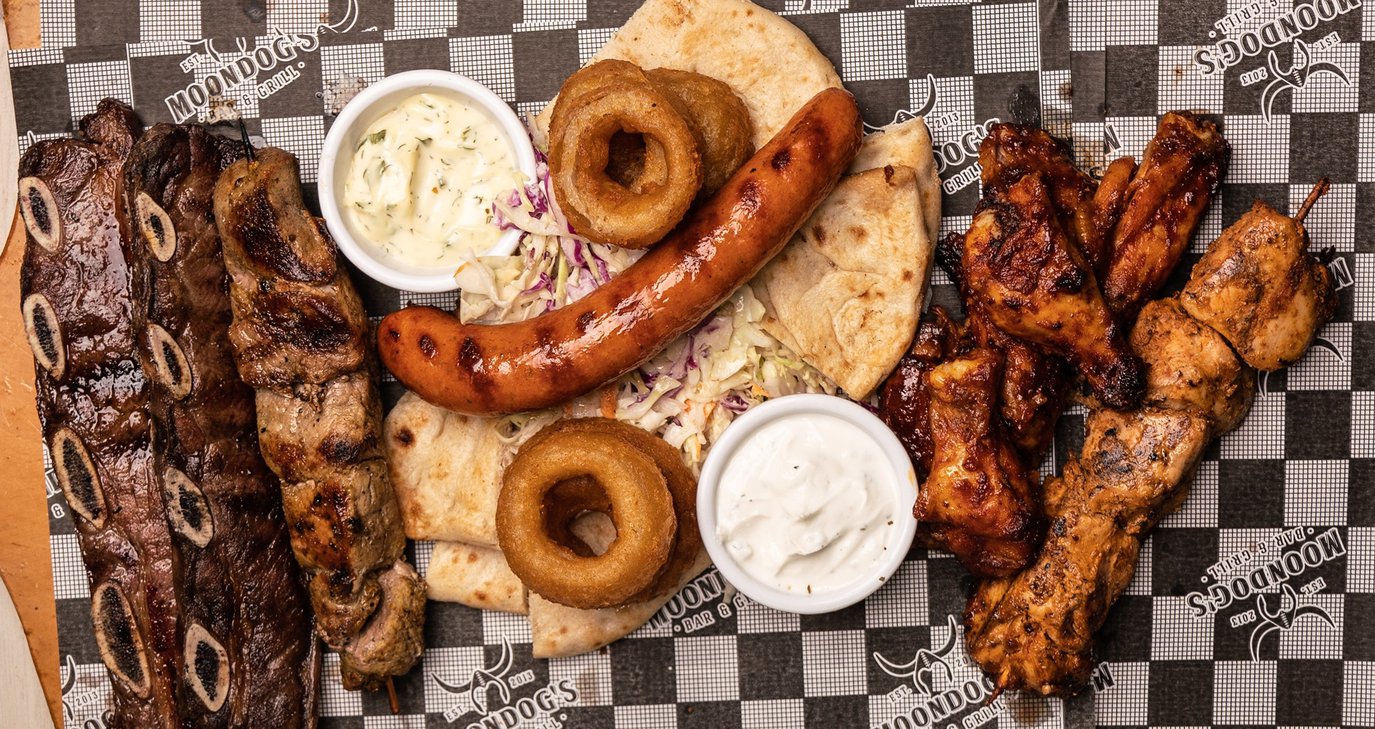 Από το διάσημο για τις μπίρες του και όχι μόνο, Moondog's (7000 6300) στη Λευκωσία, θα παραγγείλεις γερμανικά λουκάνικα στη σχάρα σερβιρισμένα με ζεστή πίτα και 3 είδη μουστάρδας, χοιρινό σουβλάκι, φτερούγες κοτόπουλου και άλλα λαχταριστά κρέατα αλλά και συνοδευτικά. Όλα αυτά θα φτάσουν στην πόρτα σου για να τσικνίσεις όπως αρμόζει!