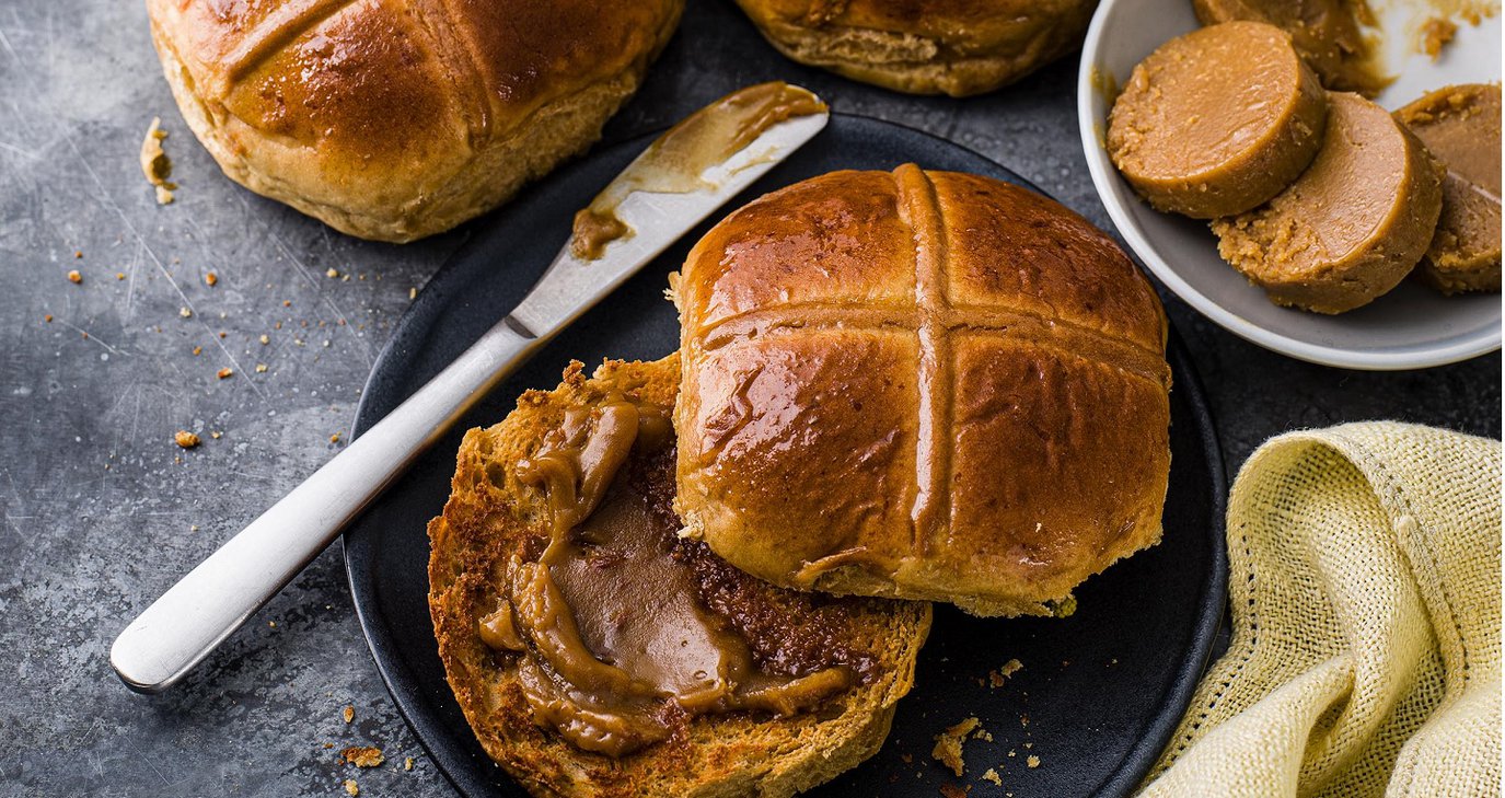 Τέσσερα σταυρόψωμα φτιαγμένα με βούτυρο και αυγά, γεμάτα ζουμερές σουλτανίνες, φραγκοστάφυλα Vostizza, φλούδες πορτοκαλιού και λεμονιού και ένα ιδιαίτερο μείγμα καρυκεύματος.
