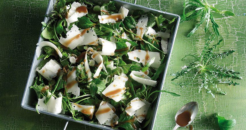 Σαλάτα με σταμναγκάθι, σπανάκι, φλούδες γραβιέρας, λαδολέμονο με σκόρδο και πετιμέζι
