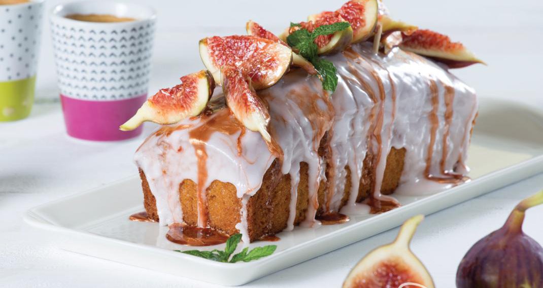 Για το γλάσο: Σε ένα μπολ κοσκινίζω την άχνη. Προσθέτω 2 κουταλιές χυμό και ανακατεύω με το σύρμα προσθέτοντας σταδιακά και αν χρειάζεται, τον υπόλοιπο χυμό μέχρι να δημιουργηθεί ένα μέτριας ρευστότητας γλάσο. Ραντίζω το κέικ με το γλάσο. Πλένω τα φρέσκα σύκα, τα κόβω σε τέταρτα και στολίζω το κέικ. Σερβίρω αμέσως.