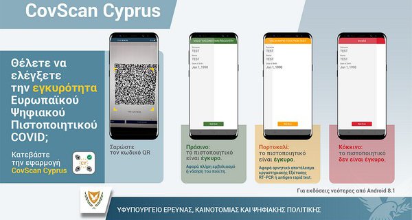 Στο πλαίσιο της προσπάθειας για βέλτιστη διαχείριση της πανδημίας, το Υφυπουργείο Έρευνας, Καινοτομίας και Ψηφιακής Πολιτικής θέτει στην υπηρεσία πολιτών και επιχειρήσεων την εφαρμογή «CovScan Cyprus», η οποία επιτρέπει τον έλεγχο της εγκυρότητας των Ευρωπαϊκών Ψηφιακών Πιστοποιητικών COVID εύκολα, γρήγορα και με ασφάλεια.