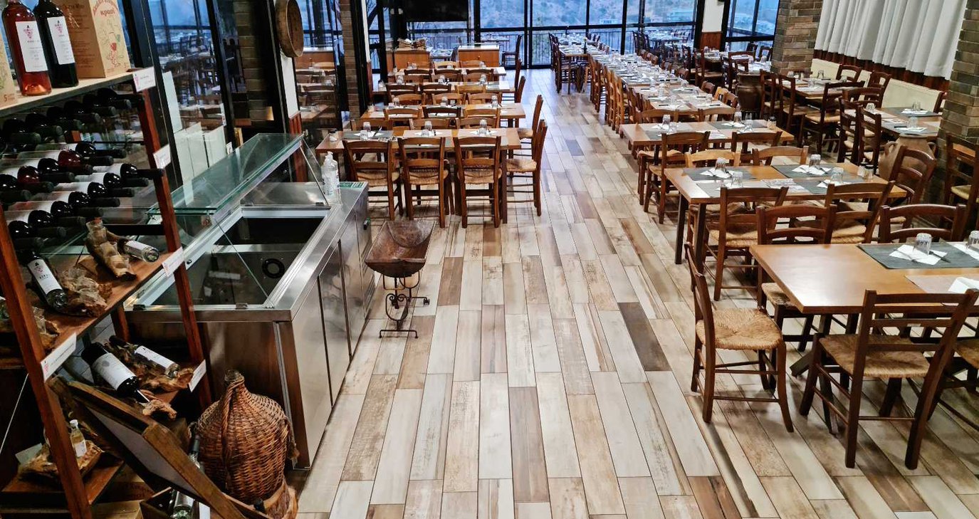 Η εκθαμβωτική κλειστή βεράντα με τα διαφανή τζάμια του εστιατορίου προσφέρει απρόσκοπτη θέα στο πανέμορφο φυσικό τοπίο που απλώνεται μπροστά σου, όσο εσύ θα απολαμβάνεις πραγματικά καλό φαγητό, μέσα στη ζεστασιά που προσφέρει η ξυλόσομπα που βρίσκεται στο κέντρο του εστιατορίου.