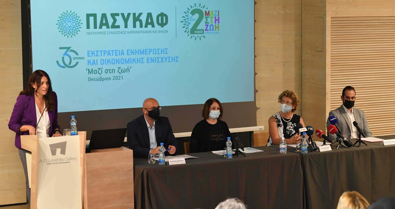 Με σύνθημα ‘Μαζί στη Ζωή’ ο ΠΑΣΥΚΑΦ πραγματοποίησε την Πέμπτη, 30 Σεπτεμβρίου, 2021 Διάσκεψη Τύπου, στη Λεβέντειο Πινακοθήκη. Σκοπός της εκδήλωσης ήταν η παρουσίαση της 30ης Εκστρατείας Ενημέρωσης και Οικονομικής Ενίσχυσης του Συνδέσμου που θα διαρκέσει όλο το μήνα Οκτώβριο, με κύριο στόχο τη συλλογή χρημάτων, για τη συνέχιση, την εξέλιξη και τη συνεχή αναβάθμιση των Υπηρεσιών και των Προγραμμάτων του Συνδέσμου.