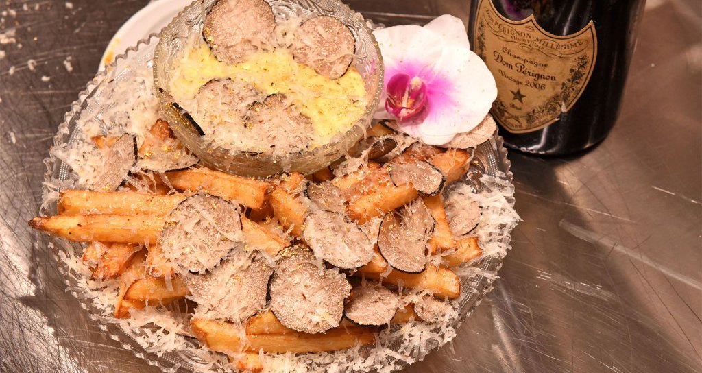 Οι πολυτελείς τηγανιτές πατάτες συνοδεύονται από μία εξ ίσου εξωφρενική σώς Mornay, φτιαγμένη από βούτυρο αγελάδων - που τρέφονται με γρασίδι - βούτυρο μαύρης τρούφας και έναν συνδυασμό ελβετικών τυριών ρακλέτ και γκριγιέρ με τρούφα.
