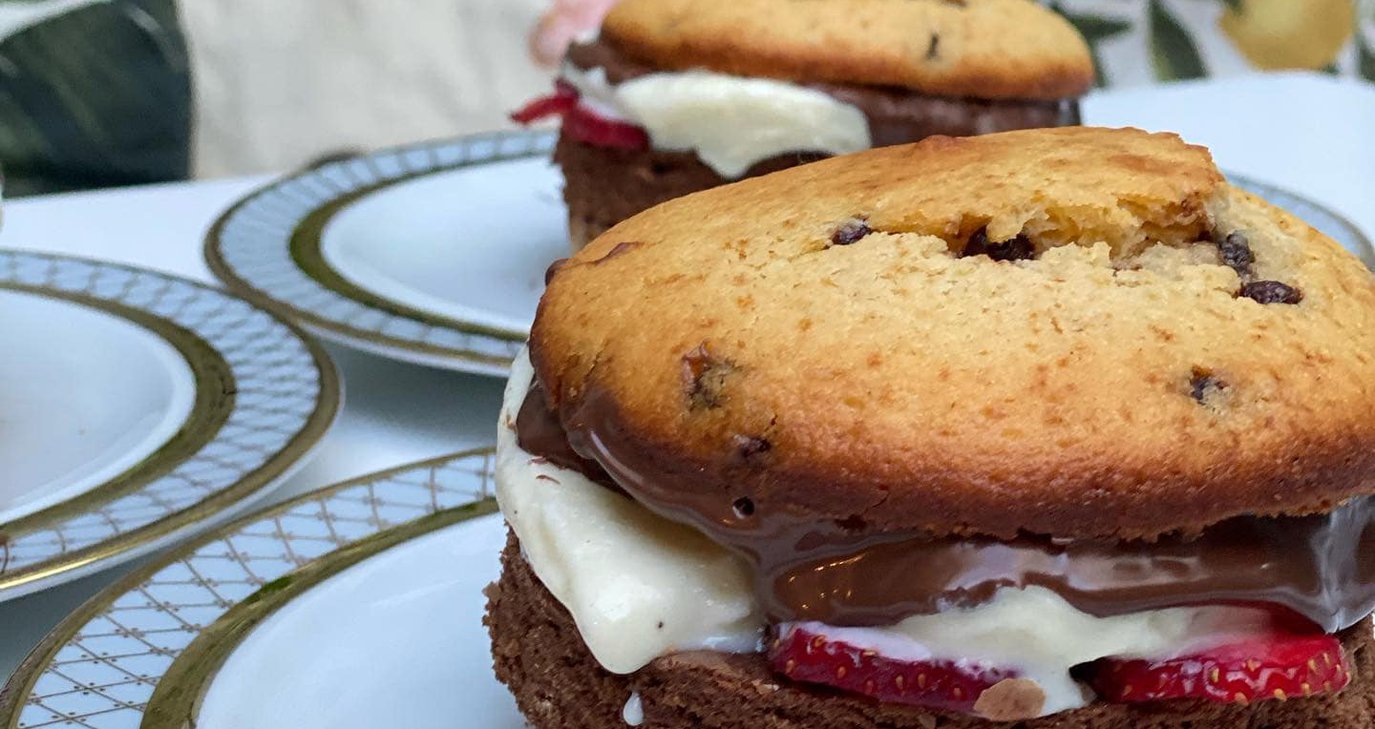 Σπιτικά chocolate chip muffin για buns, μπιφτέκι μπράουνι με fudge σοκολάτας, νουτέλα, vanilla ice cream filing και φρέσκες φράουλες.