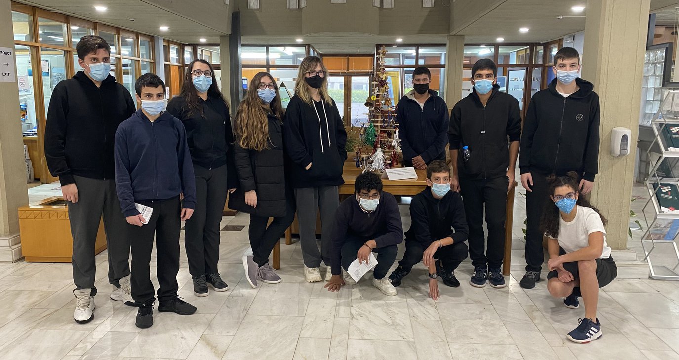 Η κατασκευή του Εναλλακτικού Χριστουγεννιάτικου Δέντρου έγινε στο πλαίσιο του Περιβαλλοντικού Προγράμματος του Σχολείου για τη Σχολική Χρονιά 2021-2022 και έχει κατασκευαστεί με πλαστικά μπουκάλια και πώματα, τενεκεδάκια, κώνους, φελλούς, κορδέλες και ξύλο.