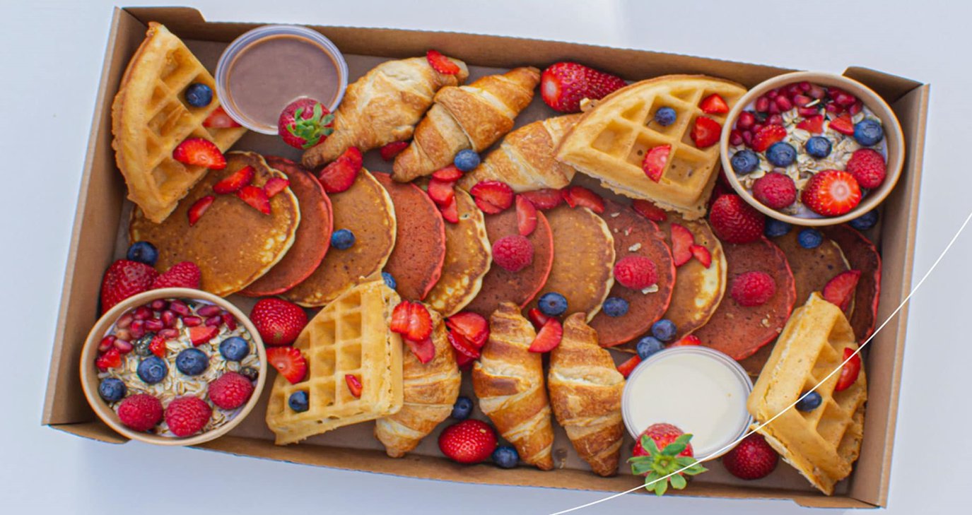 Το λαχταριστό αυτό sweet box περιέχει έξι red velvet pancakes και έξι κανονικά pancakes, μια ολόκληρη βάφλα κομμένη σε τέσσερα κομματάκια, όλα φτιαγμένα από αγνά και ολόφρεσκα υλικά, καθώς και μυρωδάτα κρουασάν βουτύρου.