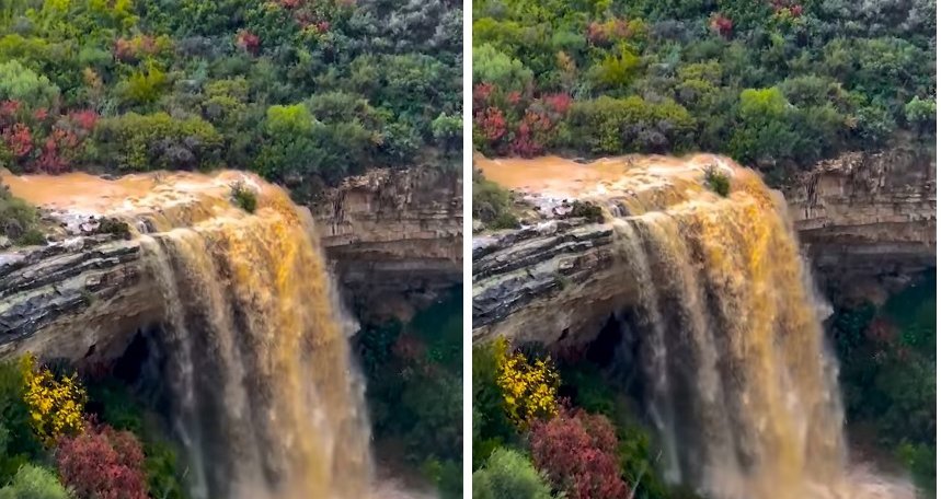 Το βίντεο, που ανήρτησε στη σελίδα «Τοπία της Κύπρου / Landscapes of Cyprus» ένας χρήστης του Facebook, δείχνει τα νερά του καταρράκτη να πέφτουν ορμητικά, δημιουργώντας ένα σχεδόν απόκοσμο σκηνικό.