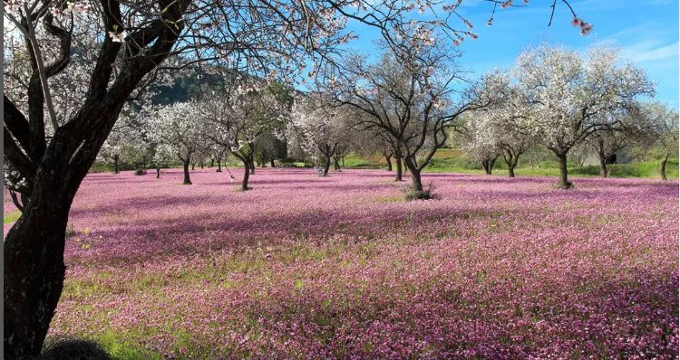 Απαραίτητη προϋπόθεση, φυσικά, είναι το χωράφι να μην έχει οργωθεί. Τα λουλούδια που είναι Σφυρούιν (Lamium Amplexicaule ή το λάμιον το περίβλαστον) και μενεξεδιά Σιλήνη, σε συνδυασμό με τις ανθισμένες αμυγδαλιές, την καταπράσινη φύση και το βουνό Κορφή ως background δημιουργούν ένα πανέμορφο τοπίο.