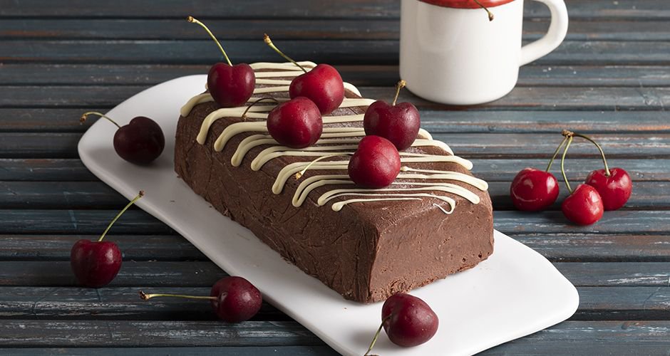 Σερβίρουμε το γλυκό με λιωμένη λευκή κουβερτούρα και φρέσκα κεράσια.