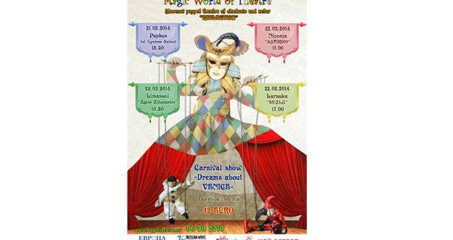 Ο Αρλεκίνος, ο Πιερότος και η Κολομπίνα προσκαλούν τα παιδιά και τους γονείς τους να παρακολουθήσουν ένα πολύχρωμο καρναβαλίστικο φαντασμαγορικό σόου Όνειρα για την Βενετία, με φωτεινά κοστούμια, και πρόσωπα κρυμμένα πίσω από τις μάσκες... Δύο τζέντλεμαν προσπαθούν να κερδίσουν την εύνοια μιας ντάμας. Τριγύρω πετούν ερωτευμένες πεταλούδες και ακούγεται κλασική μουσική από βιρτουόζο μουσικό. Τελικά είναι όνειρο ή πραγματικότητα; Ποιος παριστάνει ποιον - οι άνθρωποι τις κούκλες ή οι κούκλες τους ανθρώπους; Η απάντηση κρύβεται στη φαντασία σας...την οποία θα διευρύνετε με το θέατρο και το κουκλοθέατρο σκιών της Μόσχας "Οτραζένιε" (Reflection) το οποίο θα βρίσκεται στην Κύπρο από τις 21 μέχρι τις 23 Φεβρουαρίου παρέα με μινιατούρες με μαριονέτες, παραστάσεις κλόουν, κόλπα με λουλούδια, παραστάσεις με διαδραστική συμμετοχή του κοινού, μαγικά κόλπα, φάρσες και αστεία.