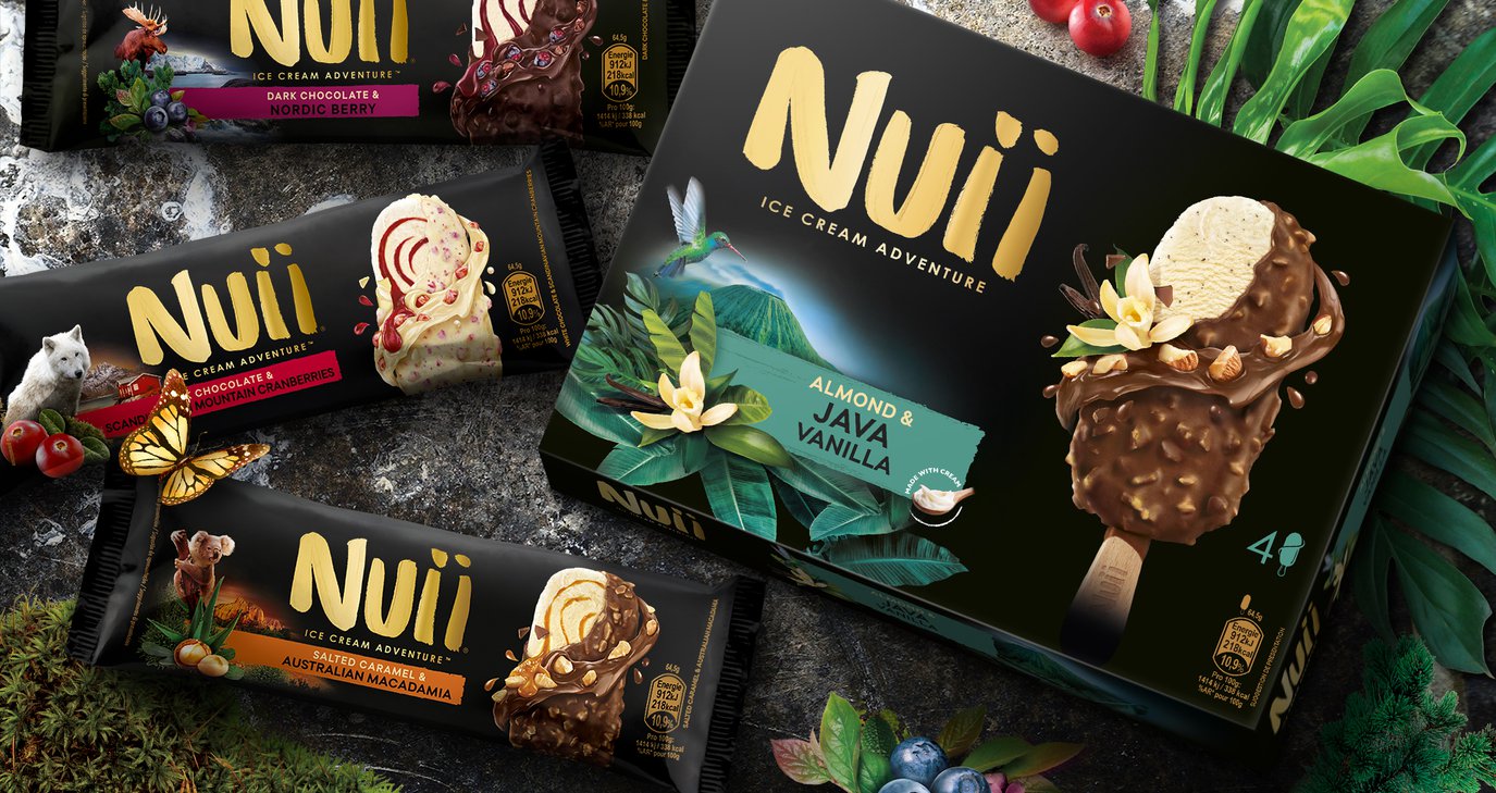 Κάθε παγωτό Nuii έχει την πιο απαλή κρέμα παγωτού γάλακτος – που ξεχειλίζει συναρπαστικές υφές και γεύσεις, με συστατικά προσεκτικά συλλεγμένα για να προκαλέσουν μία αίσθηση περιπέτειας και ανακάλυψης – και περιβάλλεται από λαχταριστή σοκολάτα.
